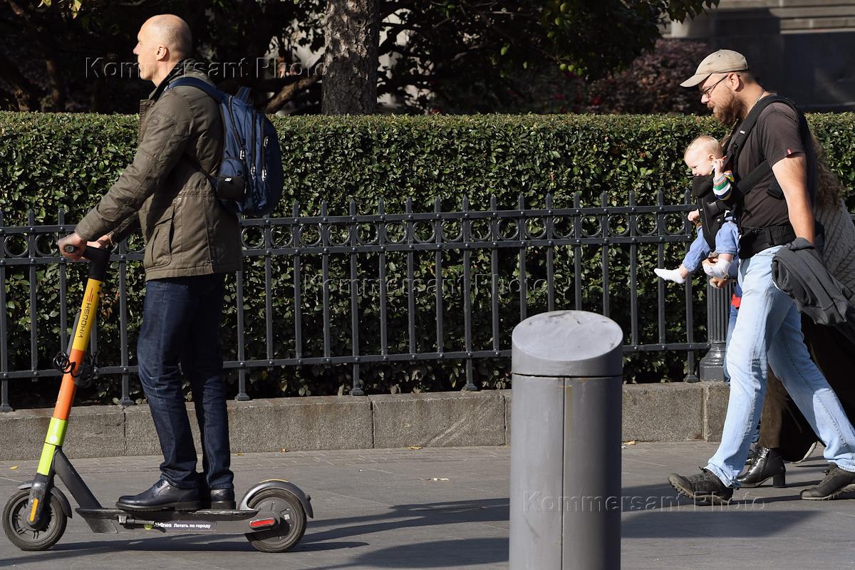 День без автомобилей. Жанровая фотография. Мужчина на самокате на улице.