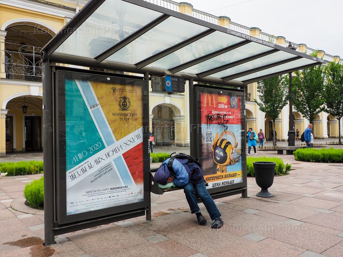 Виды Санкт-Петербурга. Жанровая фотография. Летние дни в Петербурге. Спящий человек на остановке…