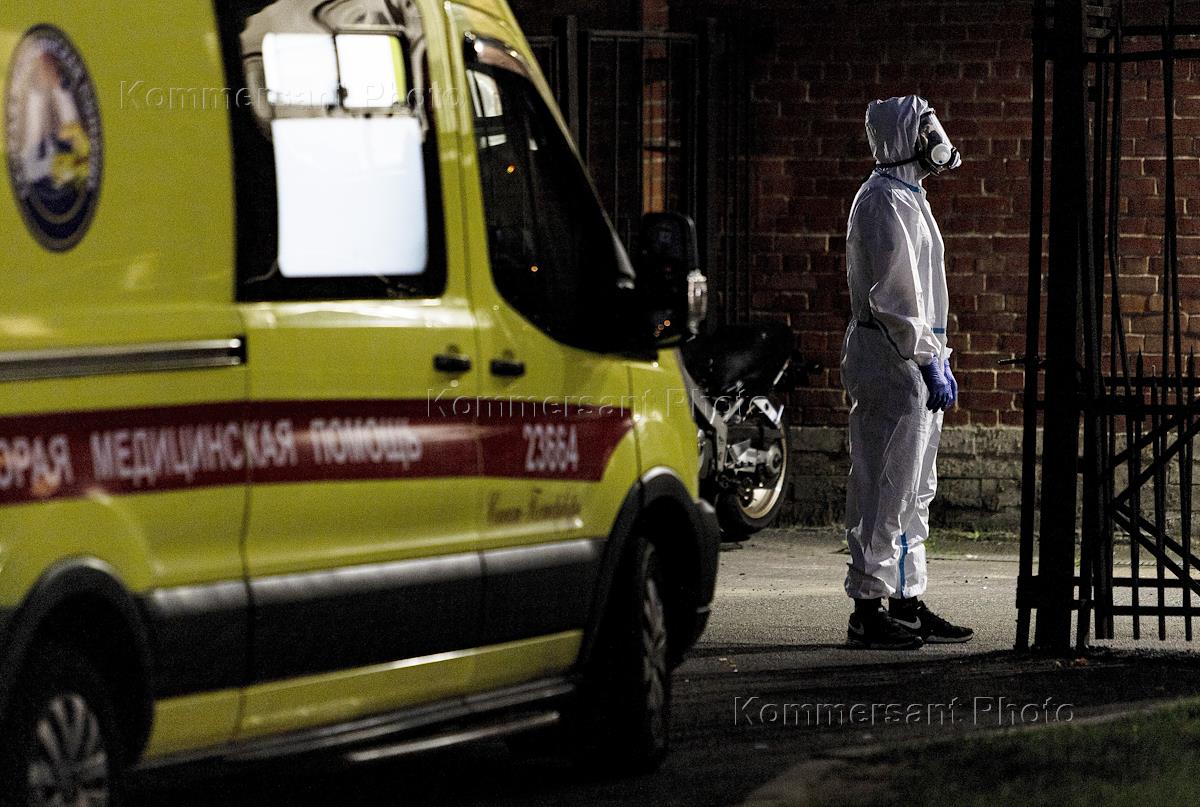 Жанровая фотография. Медицинский работник в защитном костюме у автомобиля скорой медицинской помощи…