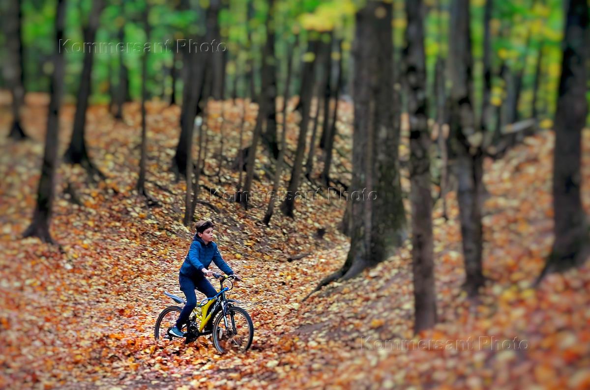 Жанровая фотография. Мальчик катается на велосипеде по осеннему парку.