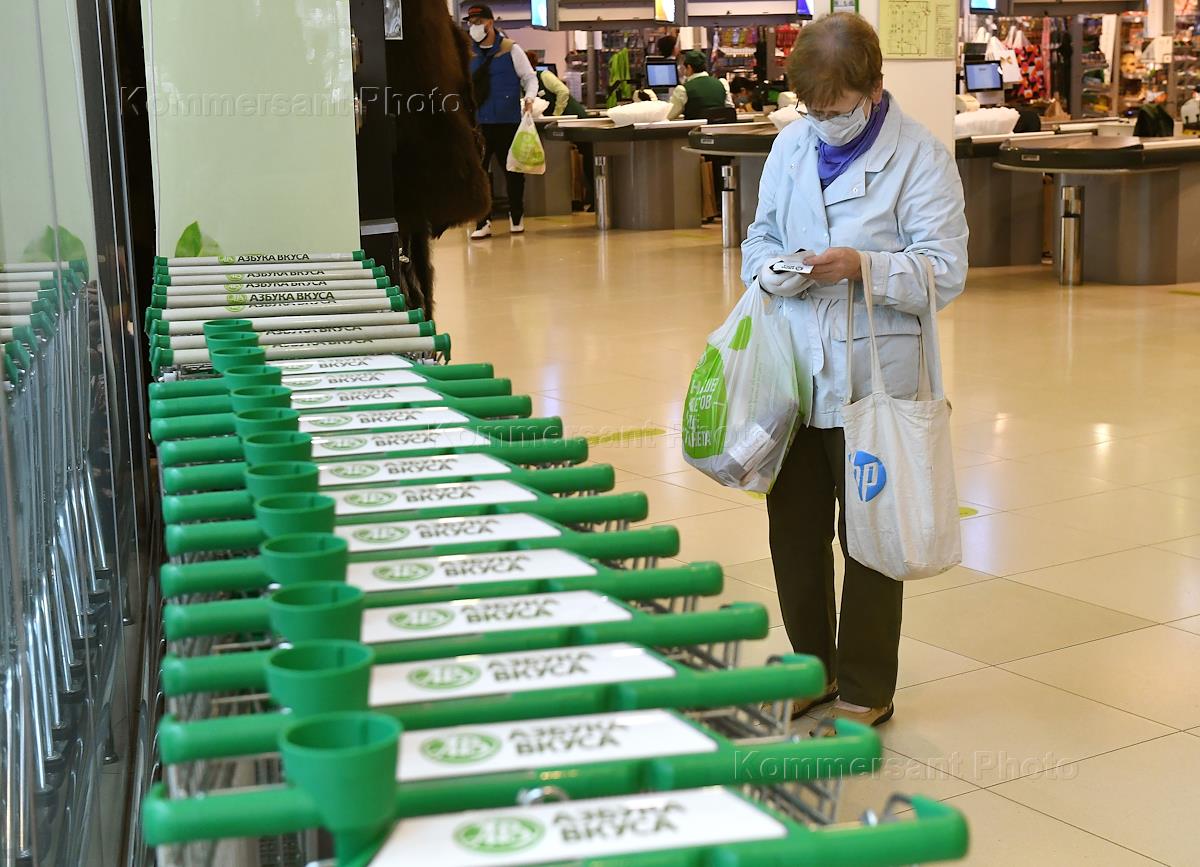 Жанровая фотография. Покупатель в медицинской маске в супермаркете "Азбука вкуса" на улице…