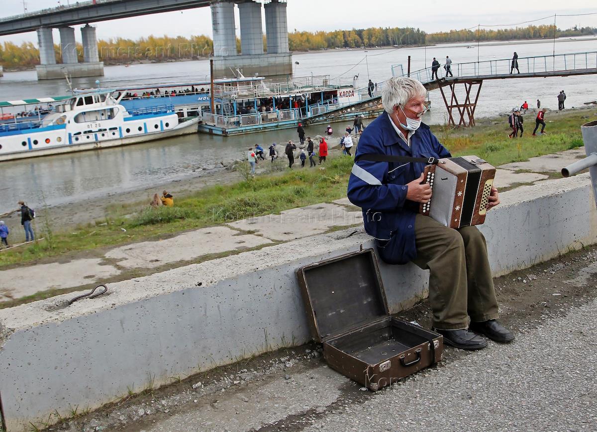 Жанровая фотография. Уличный музыкант в защитной маске играет на гармони на набережной реки Обь.…