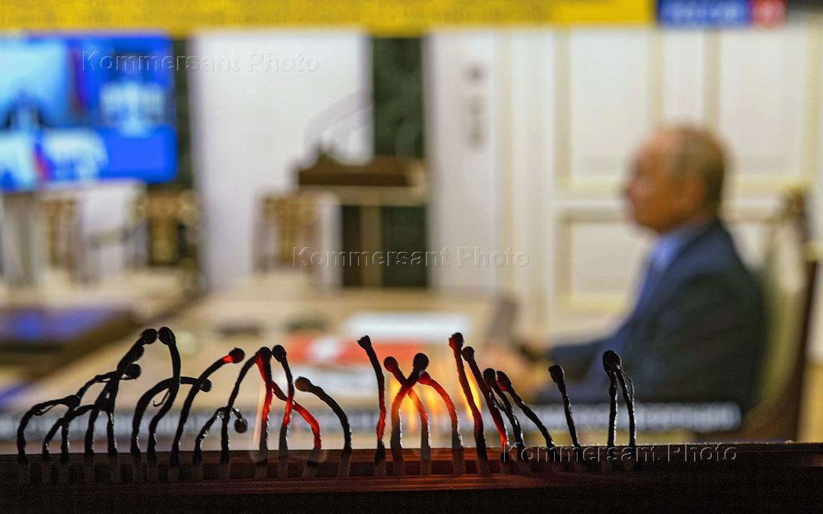 Политика Жанровая фотография. Президент России Владимир Путин провел оперативное совещание с постоянными членами Совета безопасности РФ в режиме видеоконференции.