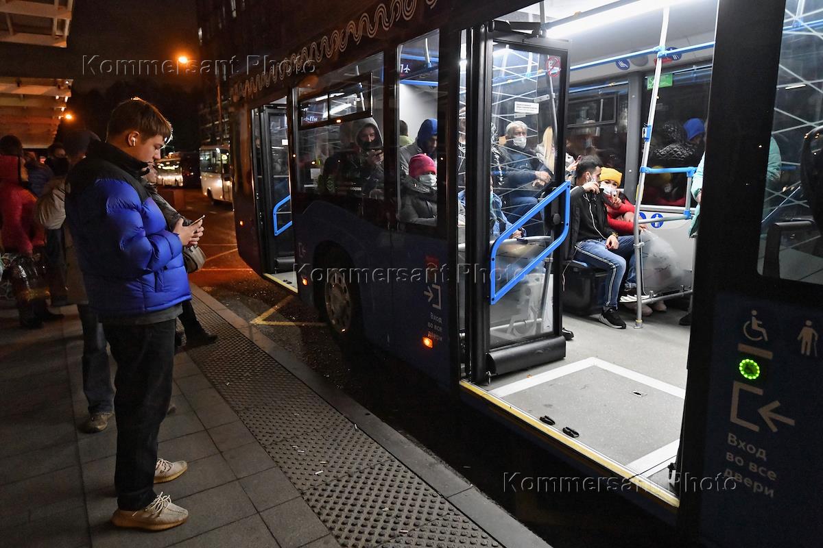 Жанровая фотография. Рейсовый автобус с пассажирами на остановке общественного транспорта.