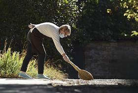 Жанровая фотография. Женщина в медицинской маске подметает улицу.
