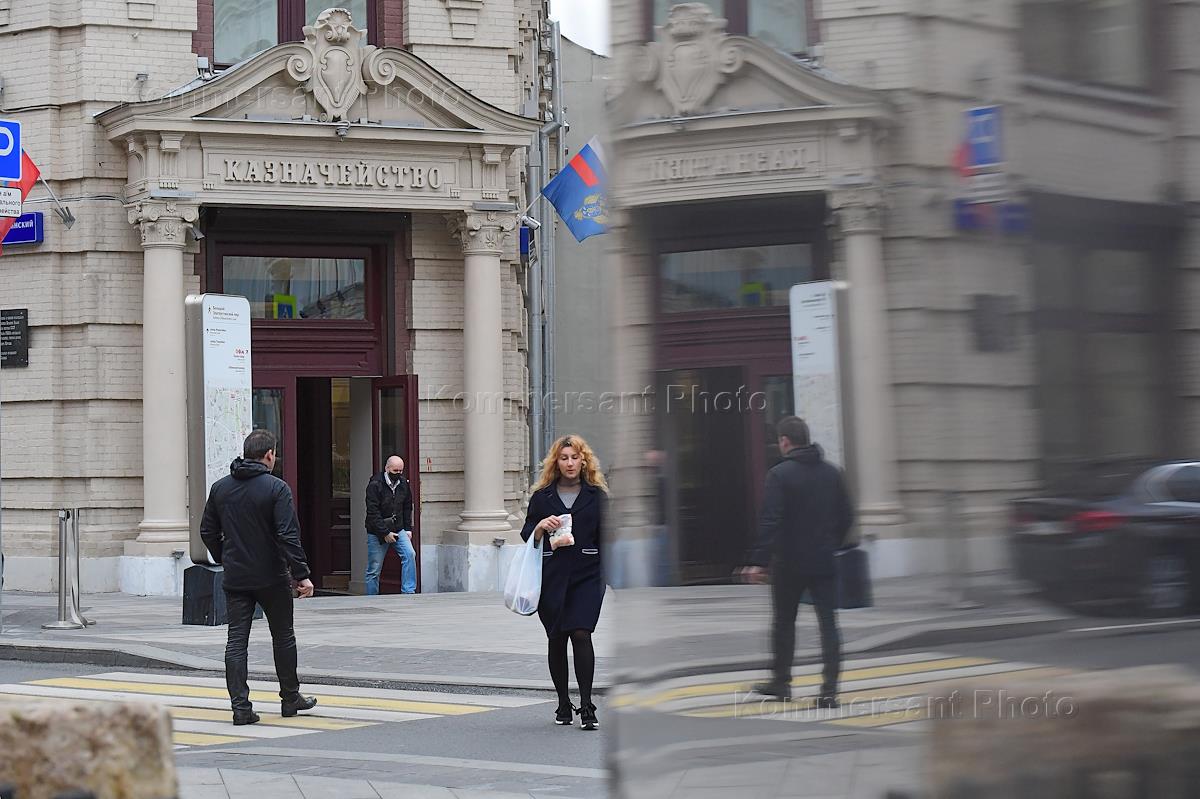 Виды Москвы. Жанровая фотография. Прохожие на улице Ильинка рядом со зданием Федерального…
