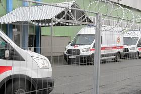 Очередь из машин скорой помощи возле временного госпиталя в 5 корпусе "Ленэкспо"