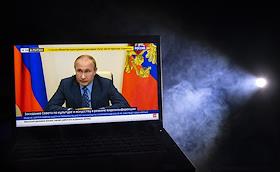 Трансляция встречи президента России Владимира Путина с членами Совета по культуре и искусству в режиме видеоконференции. Жанровая фотография.