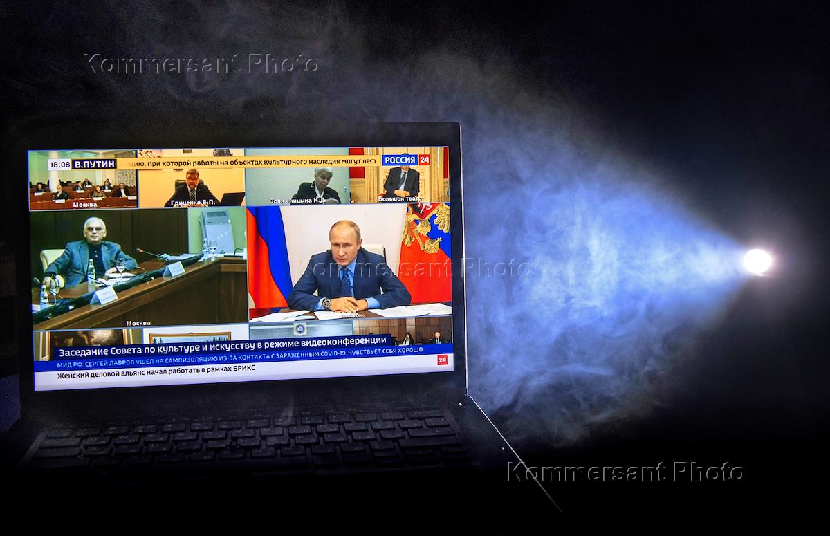 Политика Трансляция встречи президента России Владимира Путина с членами Совета по культуре и искусству в режиме видеоконференции. Жанровая фотография.