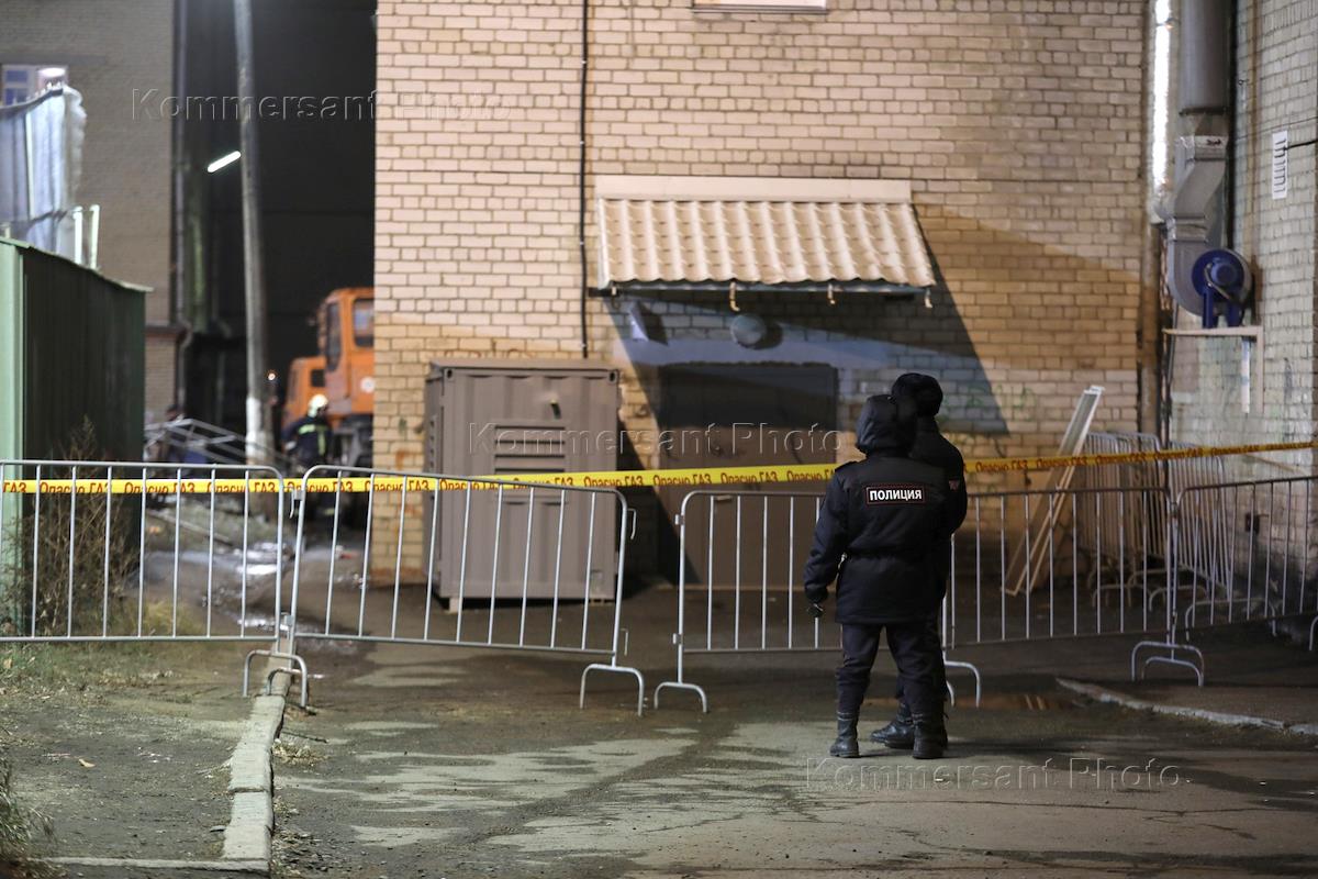 Сотрудники МЧС России на месте взрыва будки для хранения кислорода на территории городской…