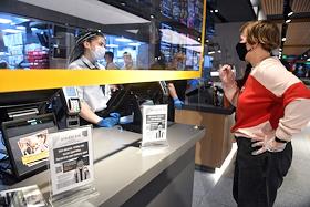 Экономика и бизнес Ограничения в работе ресторанов в условиях распространения коронавируса COVID-19. Жанровая фотография. QR-код для доступа в ресторан быстрого питания "Макдональдс".