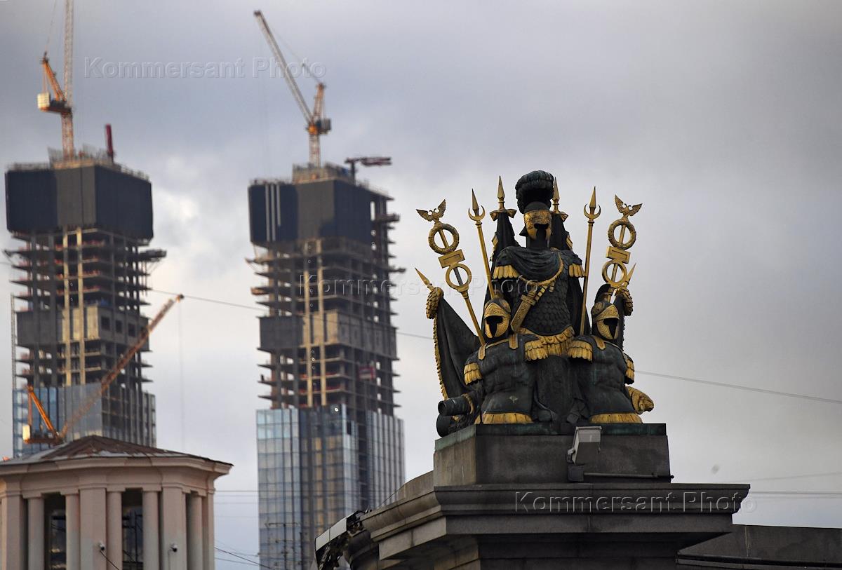 Виды Москвы. Скульптурная композиция Бородинского моста на фоне строящего жилого комплекса Capital…