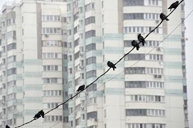 Недвижимость в поселке Трехгорка. Жанровая фотография. Голуби на проводах на фоне многоэтажного…