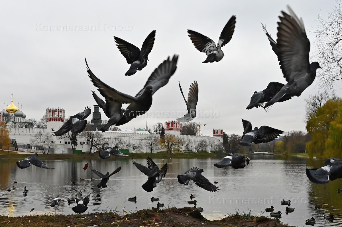 Виды Москвы. Жанровая фотография. Парк Новодевичьи Пруды. Голуби над прудом.