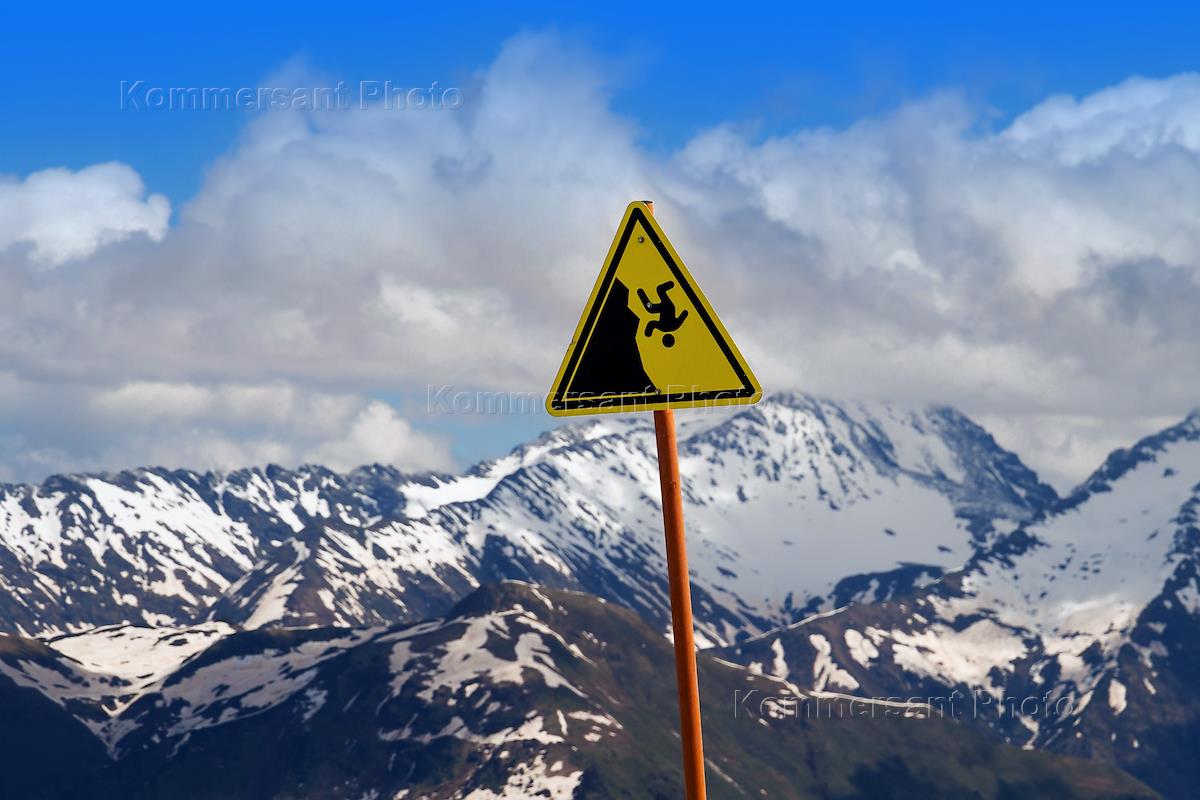 Жанровая фотография. Знак, предупреждающий туристов об опасности падения с обрыва в горах.