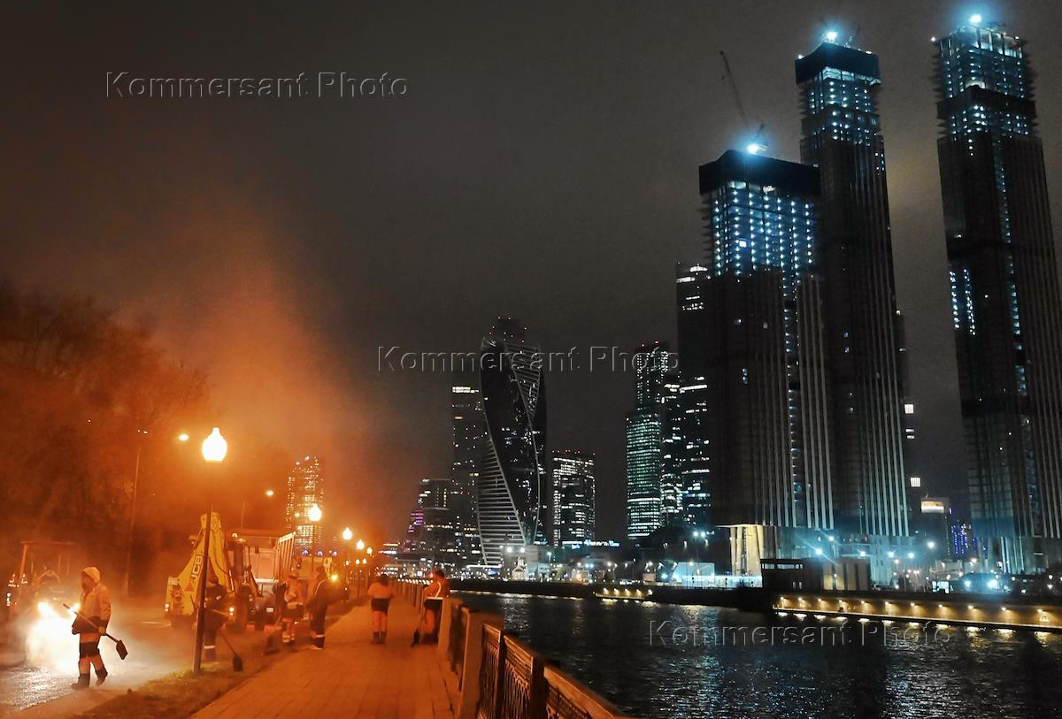 Виды Москвы. Жанровая фотография. Сотрудники коммунальных служб во время очистки набережной после…