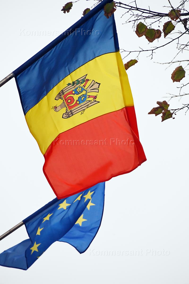 Виды Кишинева. Жанровая фотография. Флаги Респулики Молдова и флаг Европы.