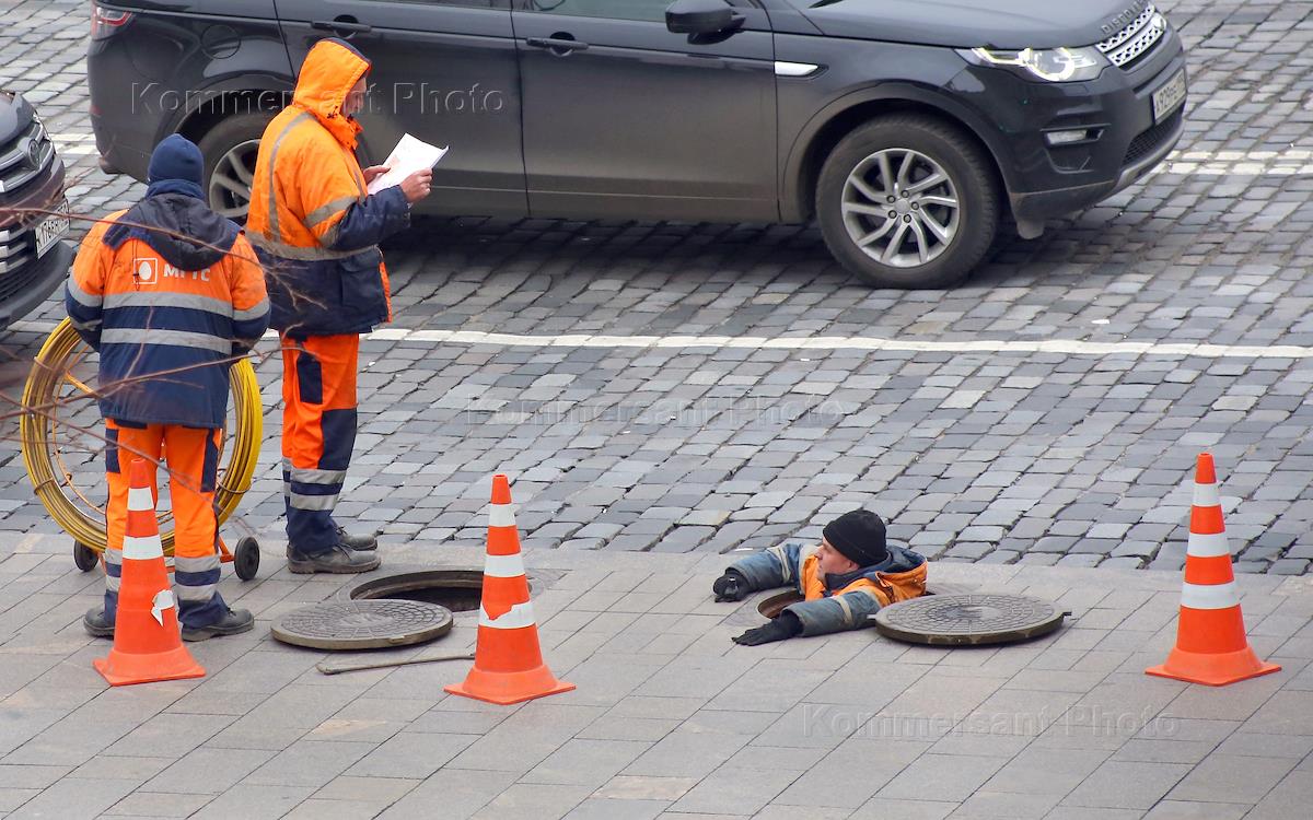 Виды Москвы. Жанровая фотография. Сотрудники коммунальных служб во время ремонтных работ возле…