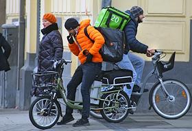 Виды Москвы. Жанровая фотография. Мужчина с велосипедом и курьер службы доставки еды Delivery Club…