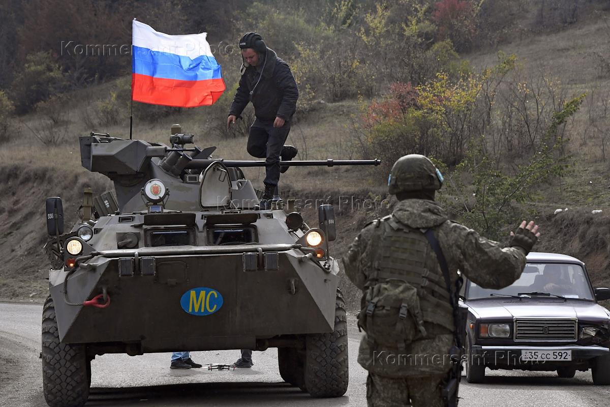 The political situation in Nagorno-Karabakh. Servicemen of the Russian peacekeeping forces on an…