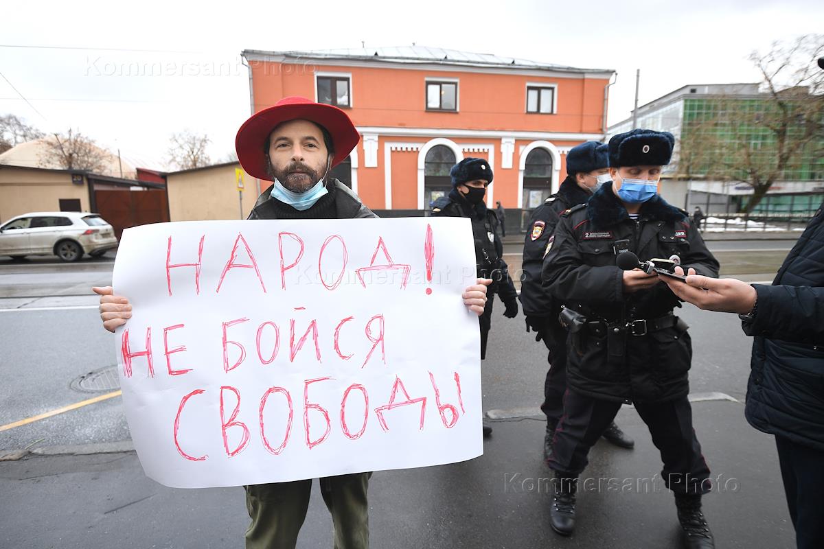 Участник одиночного пикет у здания Тверского районного суда, где проходит рассмотрение уголовного…