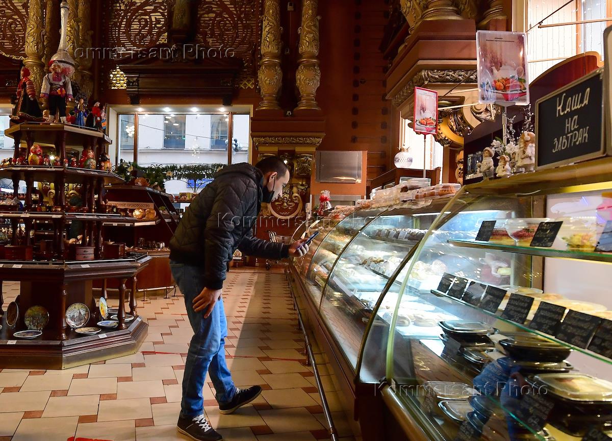 Интерьер Елисеевского магазина. Жанровая фотография. Покупатель у прилавка отдела кулинарии.