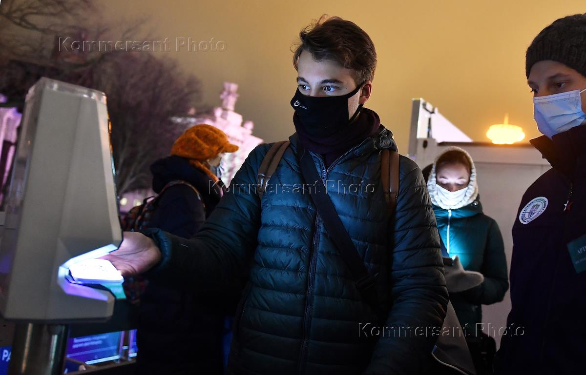 Церемония открытия катка на ВДНХ. Посетители катка в медицинских защитных масках во время считывания…