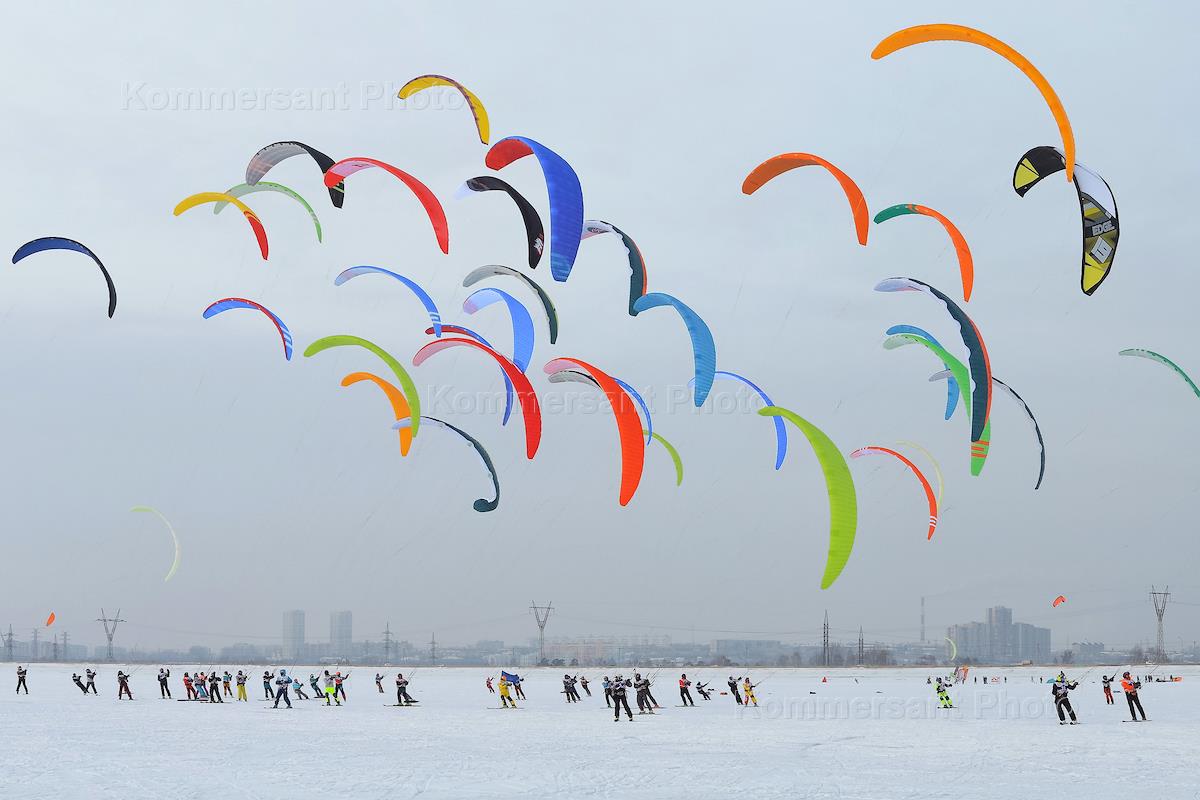 Спортсмены с кайтами во время гонки в дисциплине "курс-рейс" на Кубке Сибири по зимним дисциплинам…