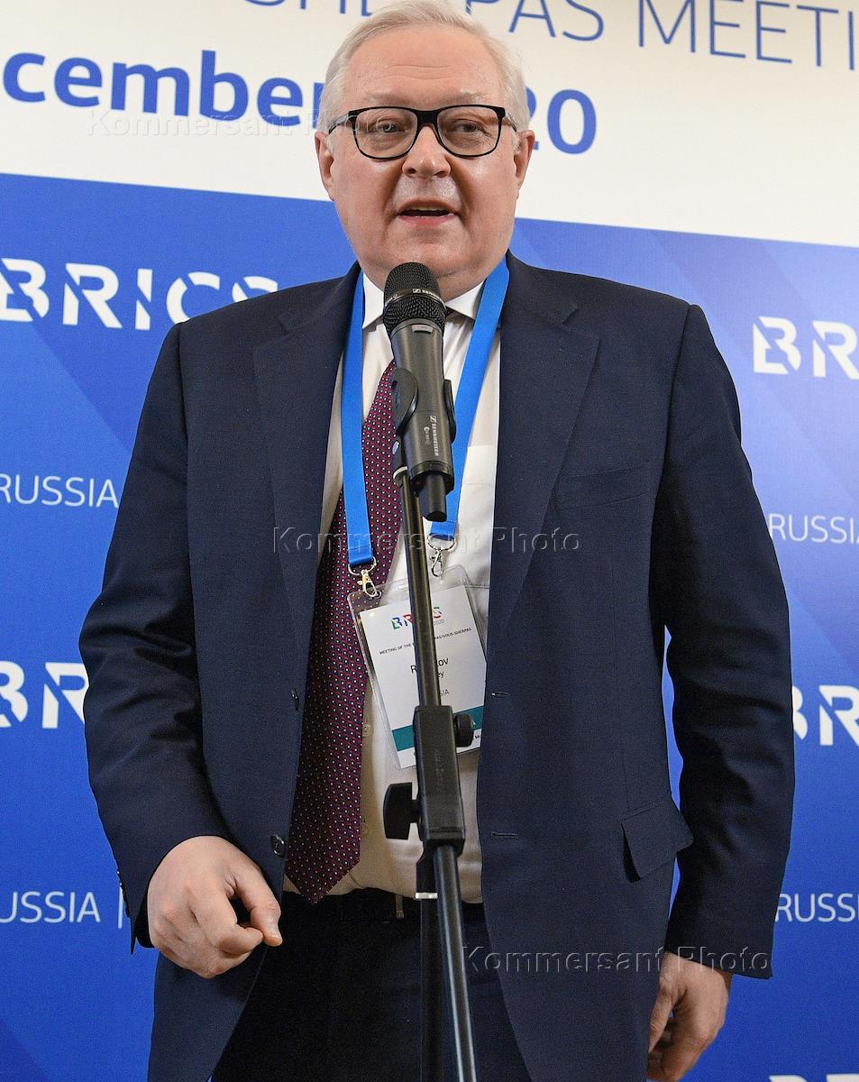 Пресс-подход Сергея Рябкова по теме участия в заседании шерп/су-шерп стран "пятерки" БРИКС в гостинице "Radisson Collection Hotel".
