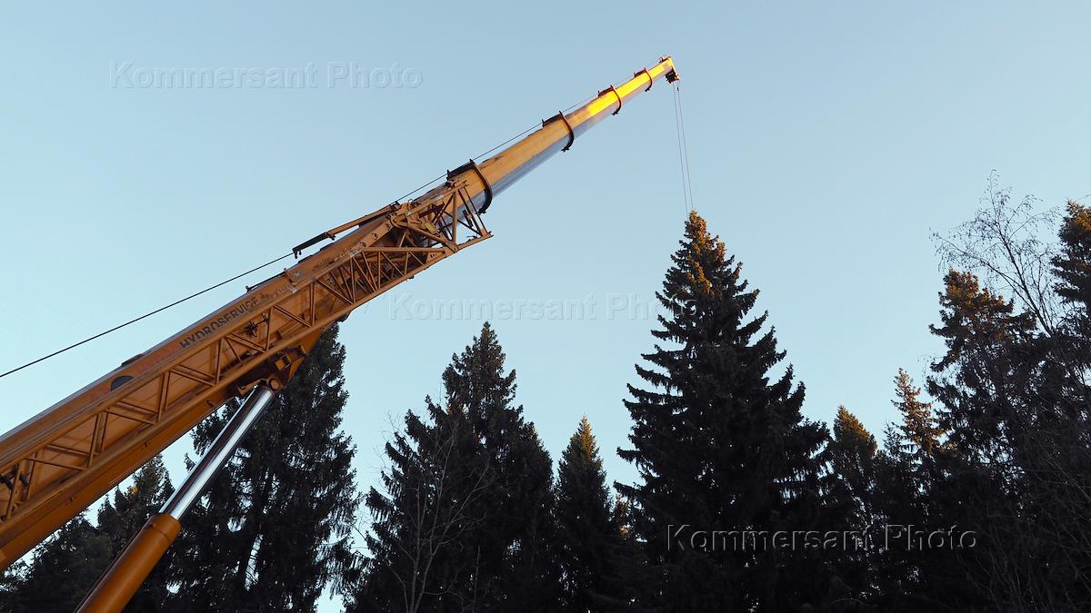 Спил ели и подготовка к транспортировке для установки на Дворцовой площади для празднования Нового года как главную новогоднюю ёлку города.