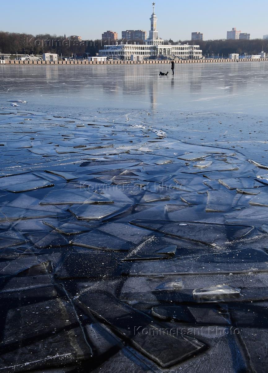 Жанровая фотография. Лед на канале имени Москвы на фоне Северного речного вокзала.