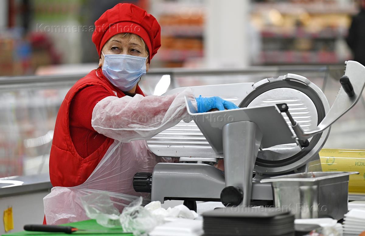 Работа гипермаркета "Ашан". Жанровая фотография. Продавец в медицинской маске и перчатках на рабочем…