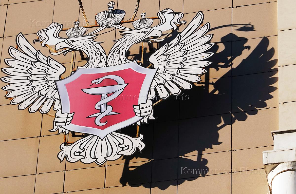 Жанровая фотография. Эмблема (герб) министерства здравоохранения России на здании министерства.
