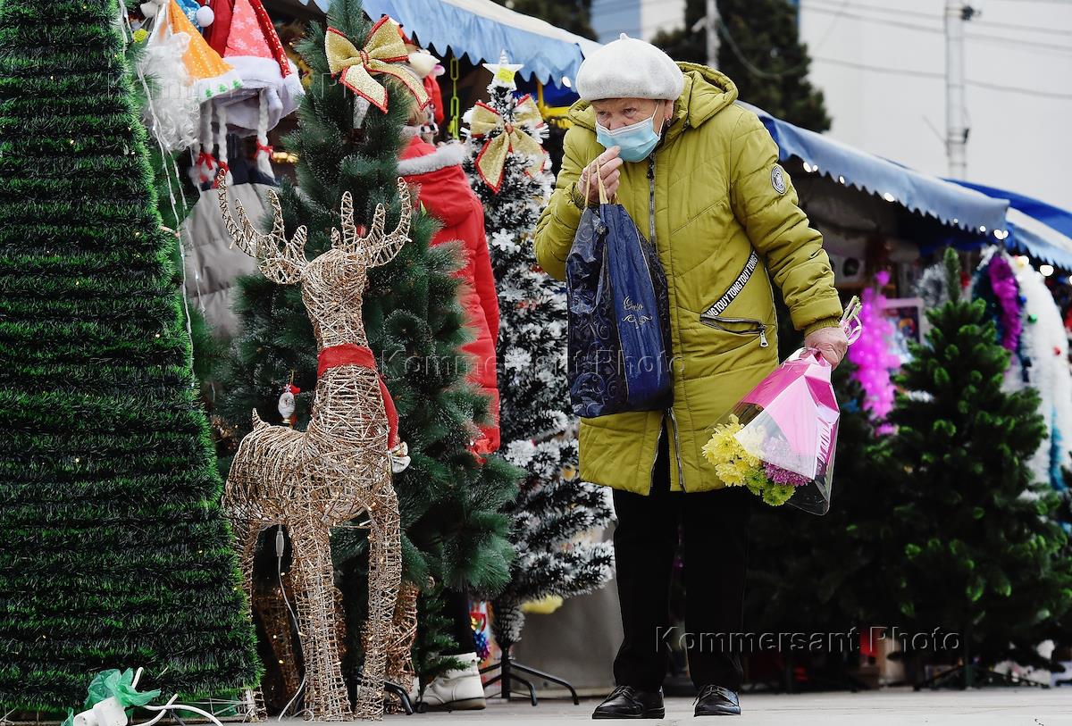 Жанровая фотография. Новогоднее украшение города. Пожилая женщина в медицинской маске на…