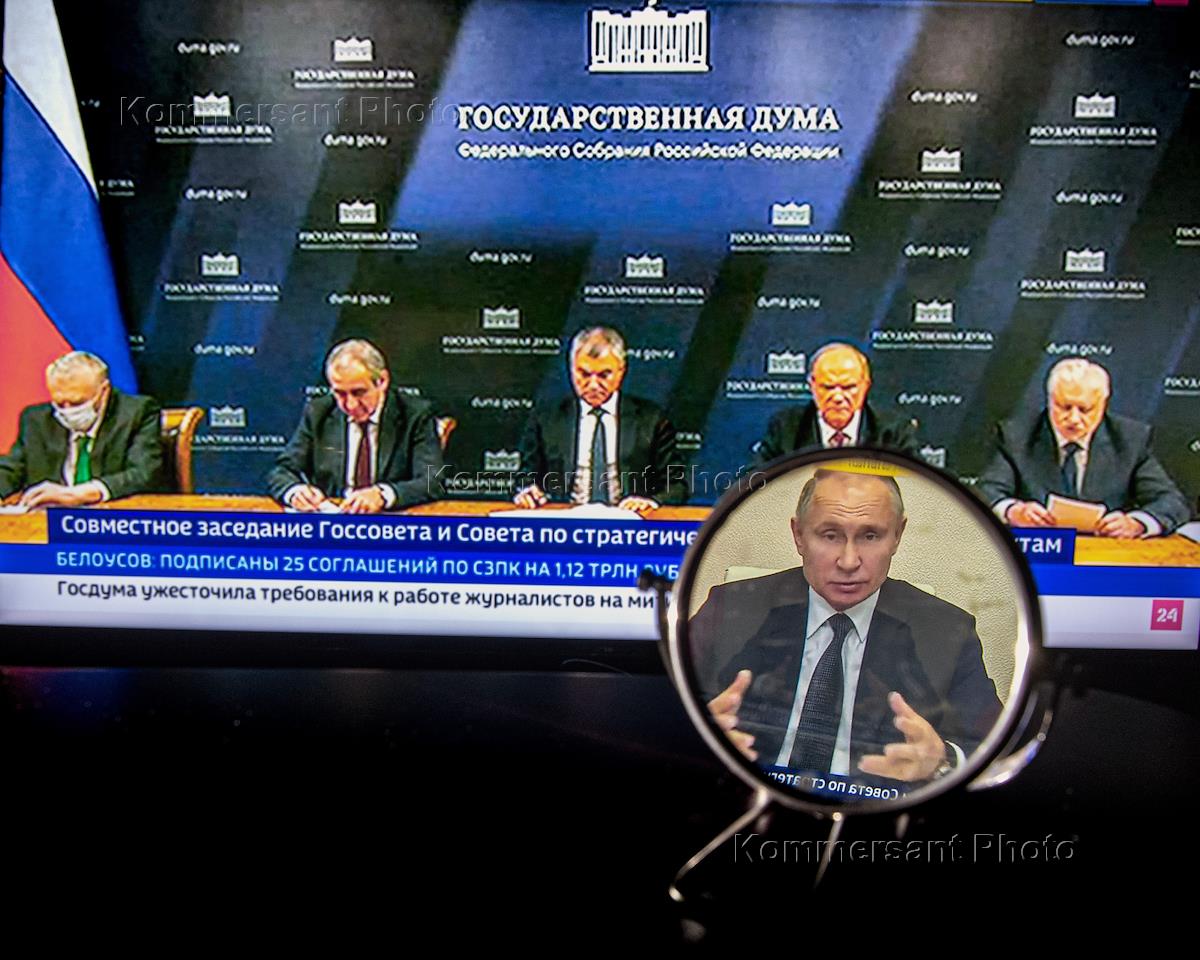 Политика Жанровая фотография. Президент России Владимир Путин провел в режиме видеоконференции совместное заседание Государственного совета и Совета при президенте России по стратегическому развитию и национальным проектам. Трансляция заседания.