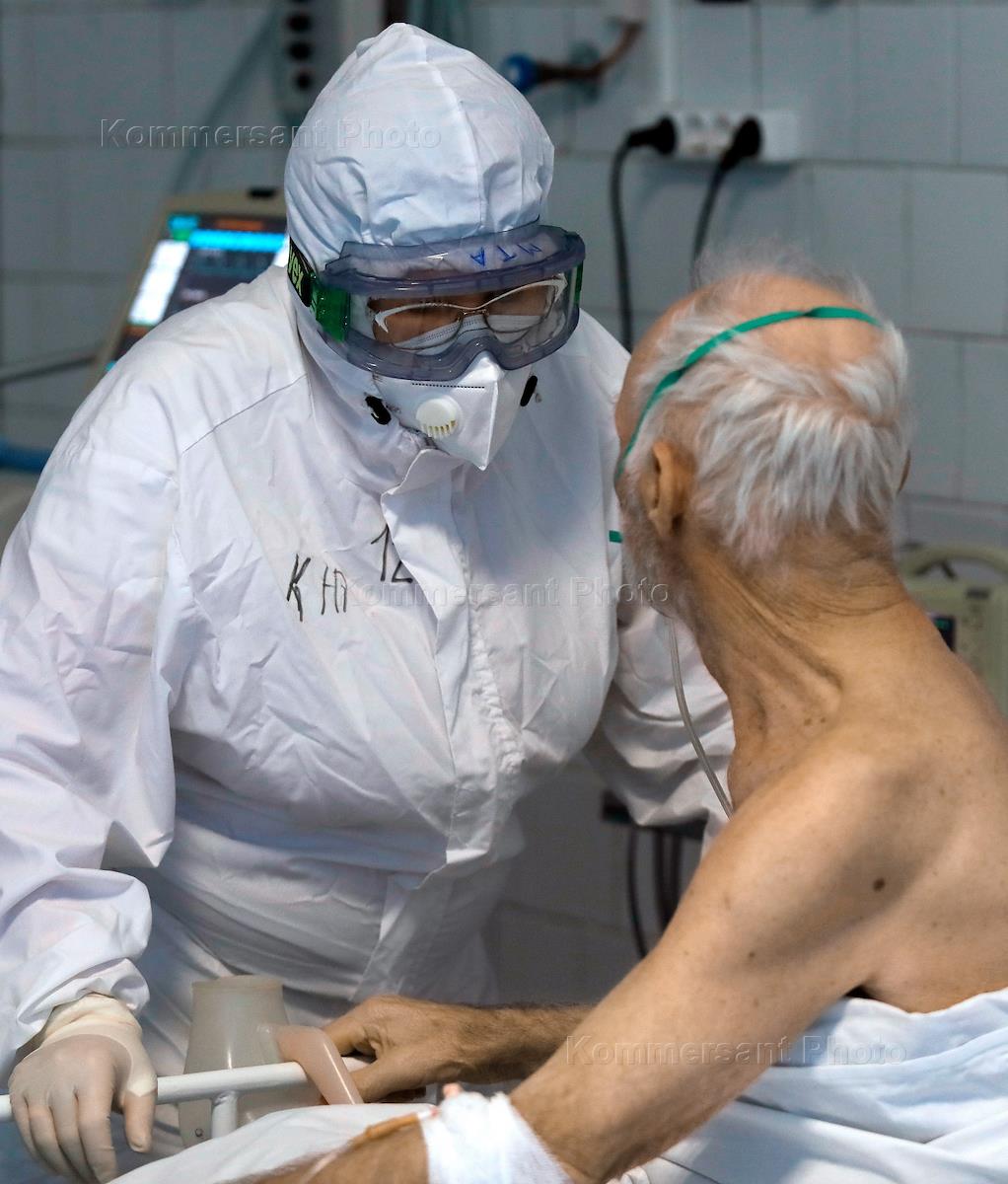 Работа сотрудников больницы в "красной зоне", где лежат пациенты, инфицированные коронавирусом.…