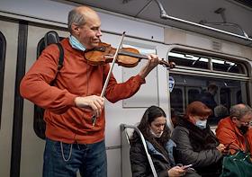 Виды Санкт-Петербурга. Жанровая фотография. Мужчина играет на скрипке в вагоне метро.