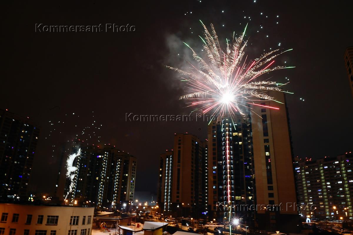 Жанровая фотография. Новогодний фейерверк во дворе жилого дома.