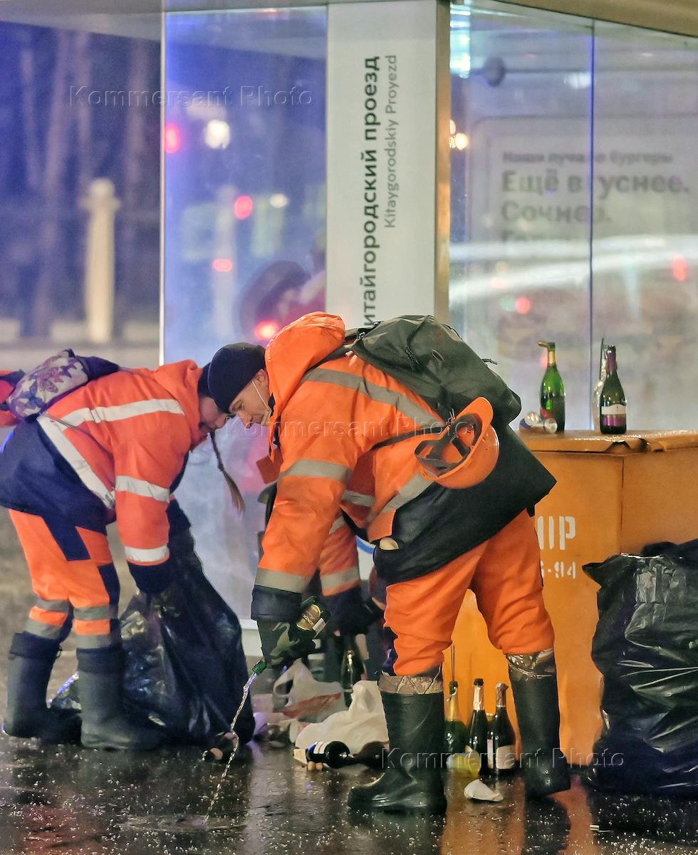 Жанровая фотография. Празднование нового года на улицах города. Сотрудники коммунальных служб во…