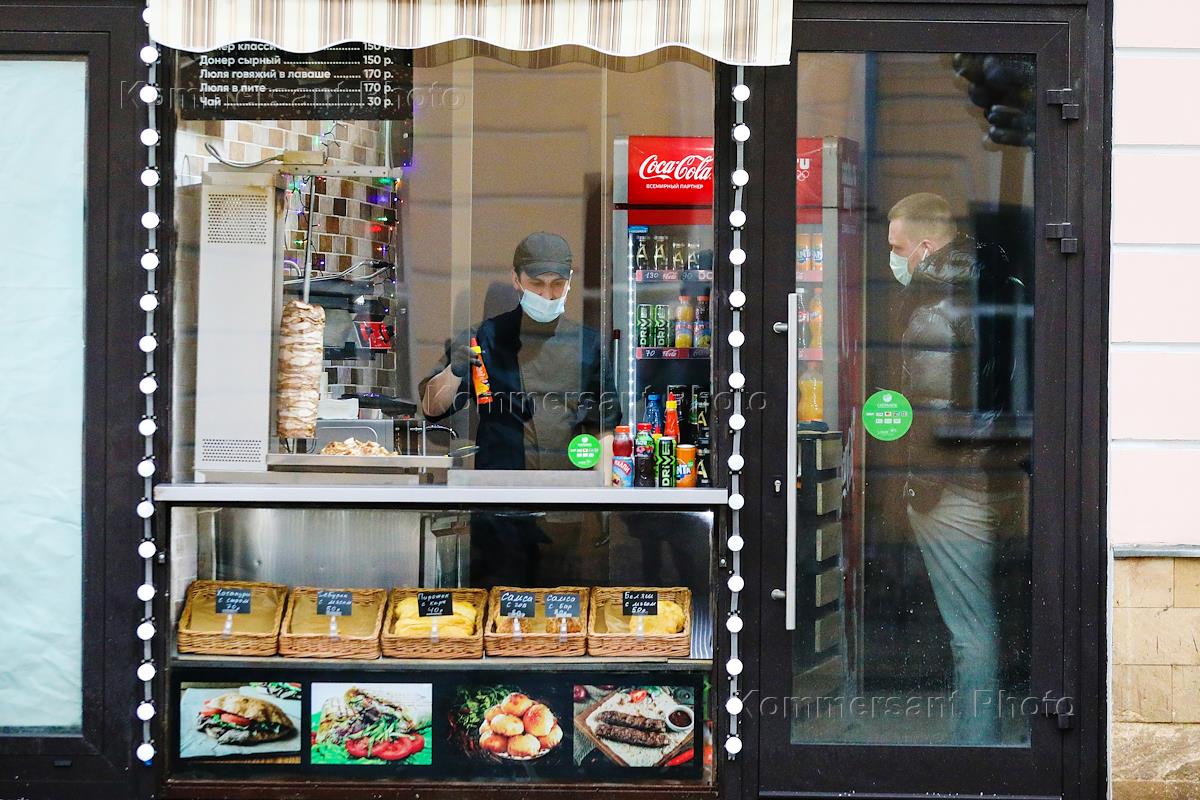Виды Москвы. Жанровая фотография. Посетитель в медицинской маске заказывает шаурму.