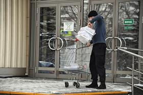 Виды Москвы. Жанровая фотография. Мужчина с пачками документов и тележкой у здания Московского…