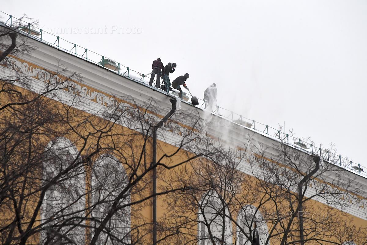 Жанровая фотография. Сотрудники коммунальной службы города во время уборки снега с крыши здания на…