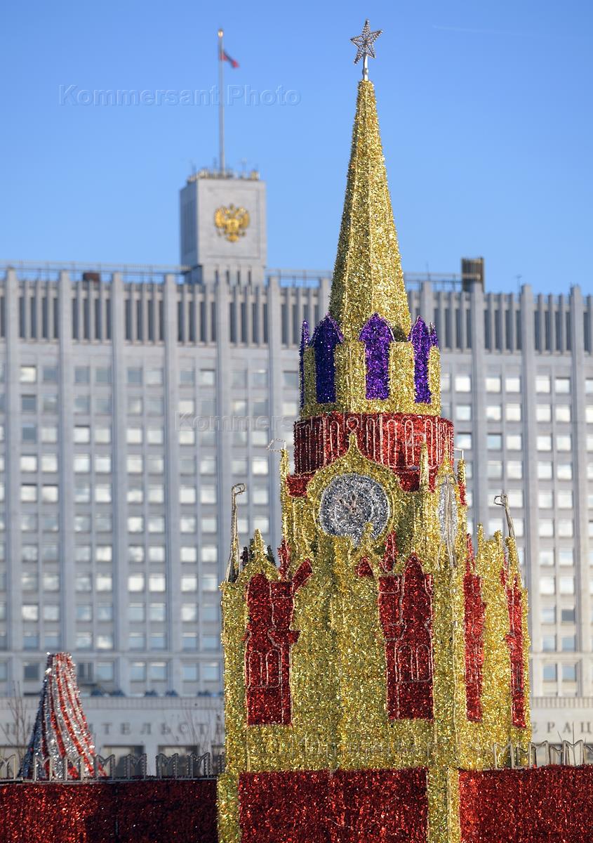 Виды Москвы. Жанровая фотография. Новогоднее оформление города. Макет Кремлевской башни на фоне Дома…