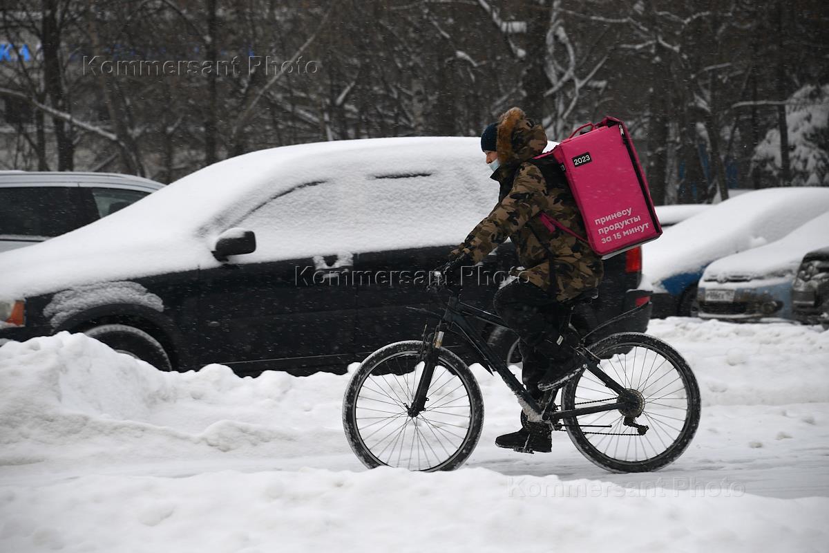 Жанровая фотография. Курьер службы доставки еды на велосипеде.