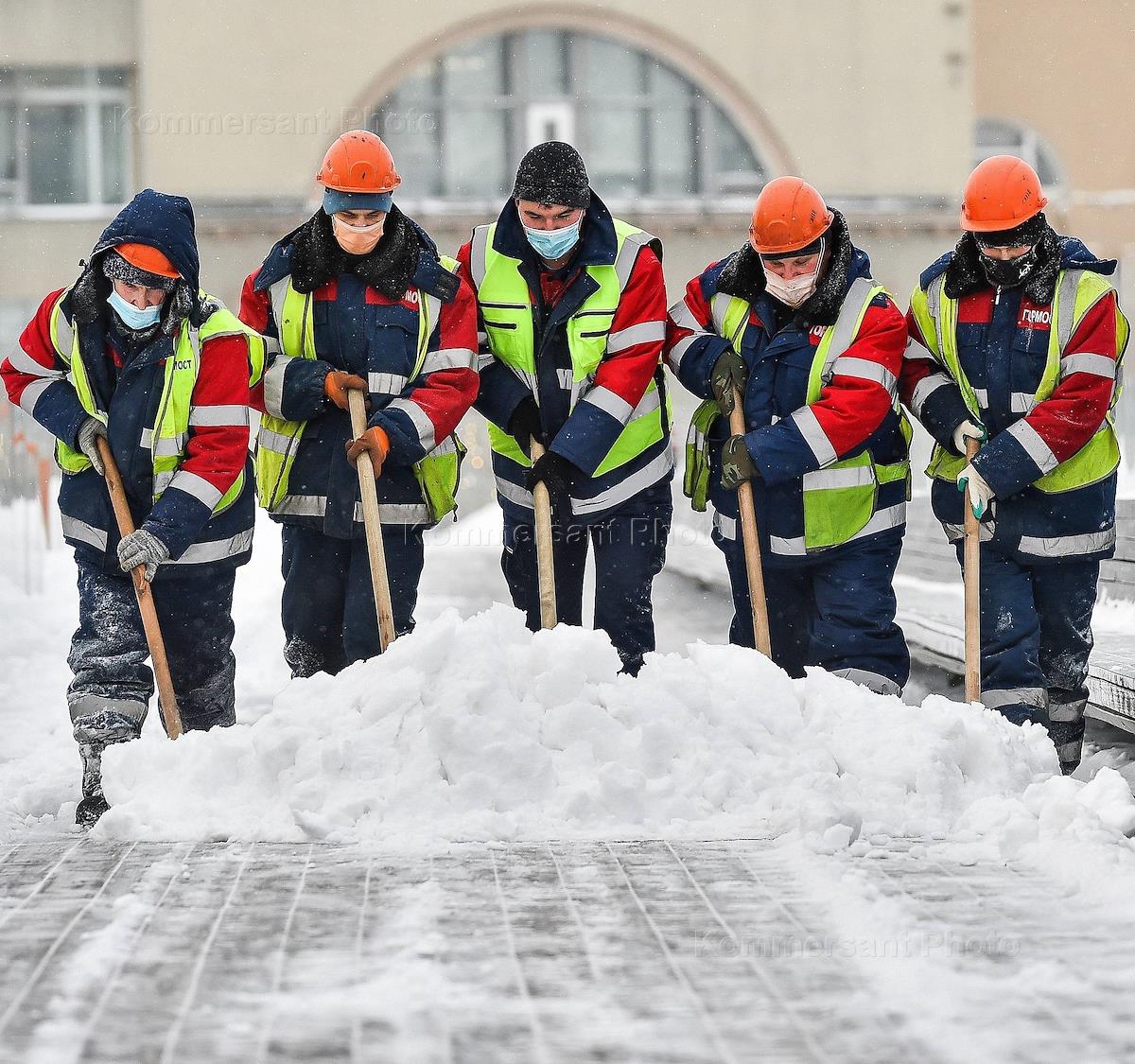 Жанровая фотография. Сотрудники компании "Гормост" во время уборки снега на "Парящем" мосту в парке…