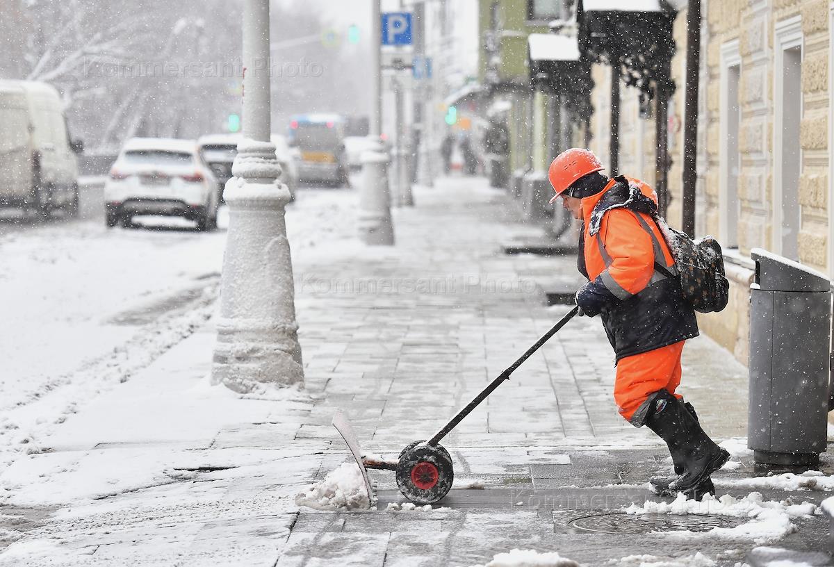 Жанровая фотография. Снегопад в Москве. Сотрудник коммунальной службы города убирает снег с улицы в…