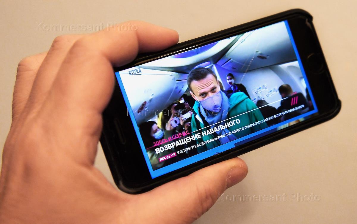 Жанровая фотография. Смартфон в руке с изображением политика Алексея Навального в самолете, который…