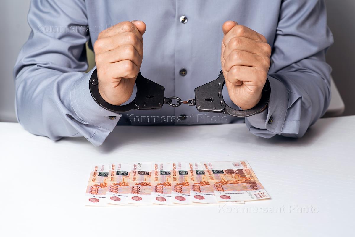 Жанровая фотография. Мужчина в наручниках. Денежные купюры по 5000 рублей на столе.
