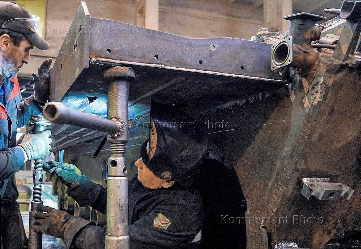 Работа 61-го Бронетанкового ремонтного завода (БТРЗ-61) в Стрельне. Рабочие в производственном цехе.