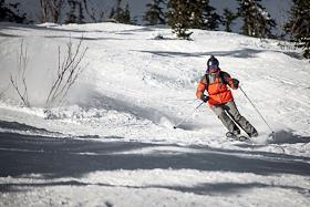 Виды Кемеровской области. Горнолыжный курорт "Шерегеш". Отдыхающий на лыжах.